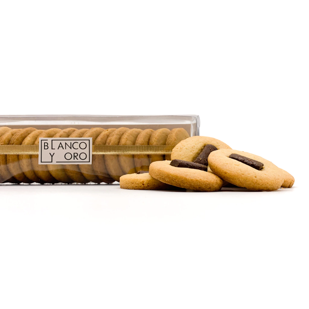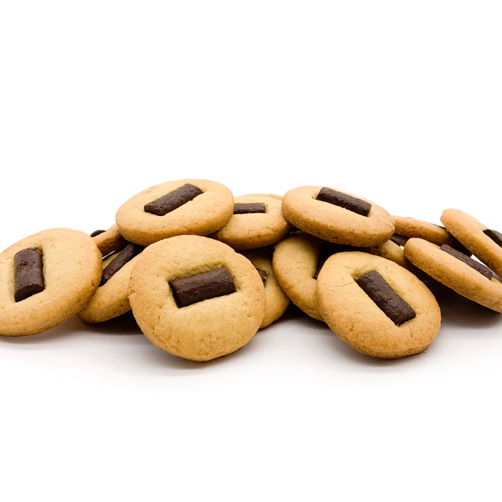Pequeñas galletitas de vainilla con un trozo de chocolate amargo.