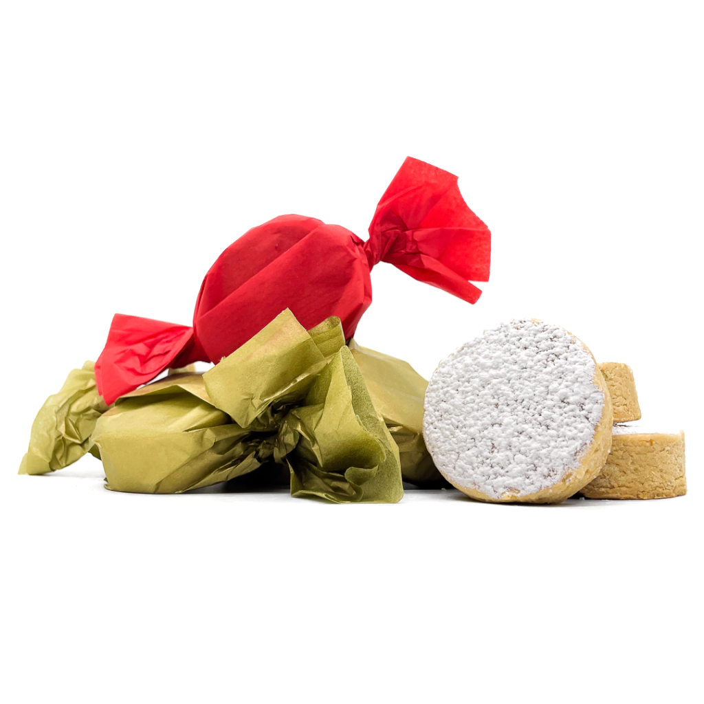 Clásicos polvorones sevillanos de almendra espolvorados con azúcar glass.